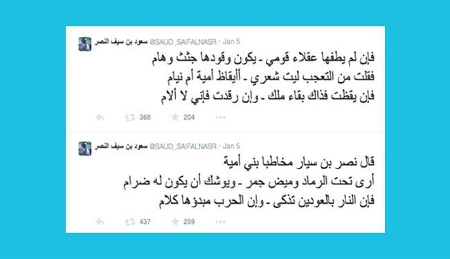 وكتب الأمير السعودي على حسابه على تويتر يوم الخامس من كانون ثاني/ يناير الجاري أبياتا من الشعر يقول فيها: "أرى تحت الرماد وميض جمر، ويوشك أن يكون له ضرام.. فإن النار بالعودين تذكى، وإن الحرب مبدؤها كلام".